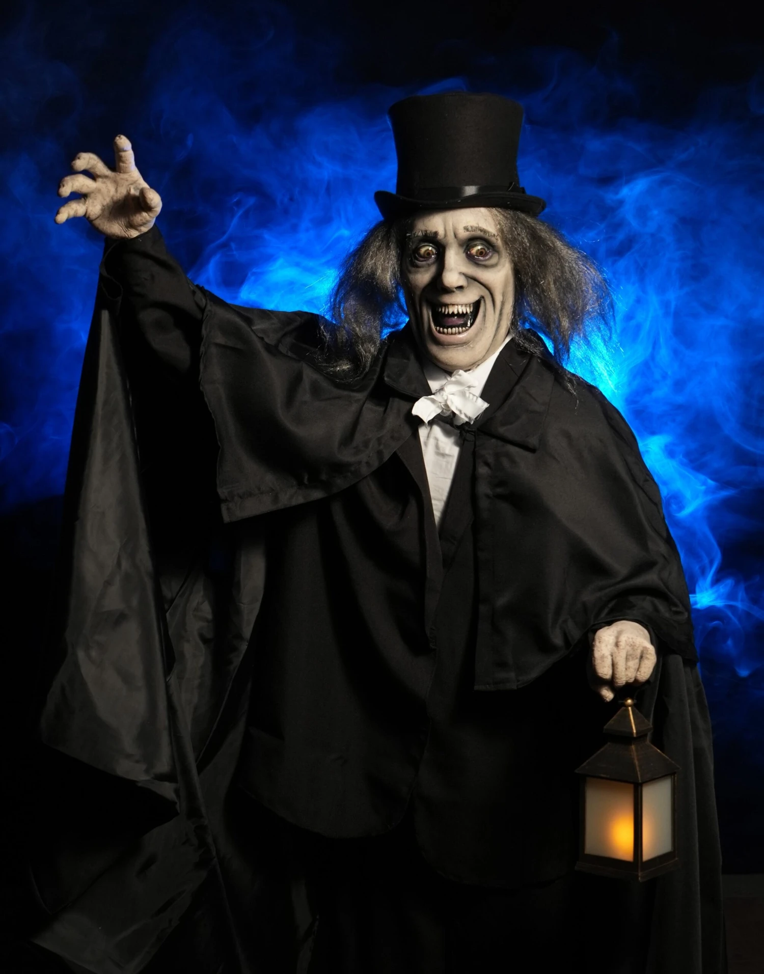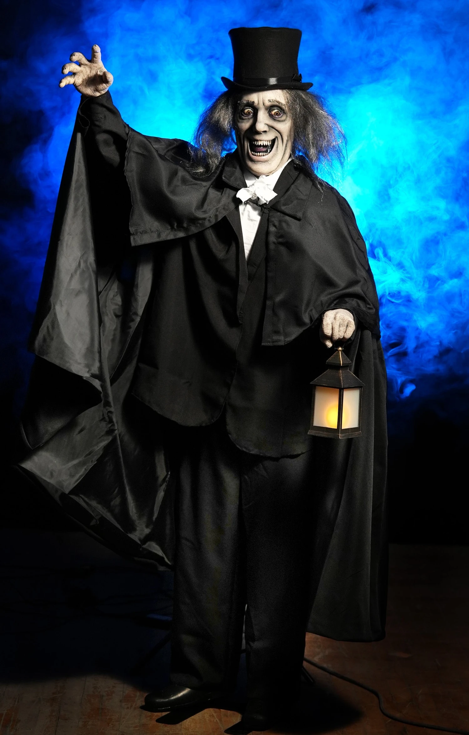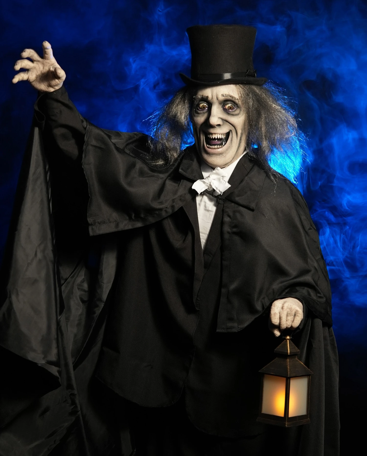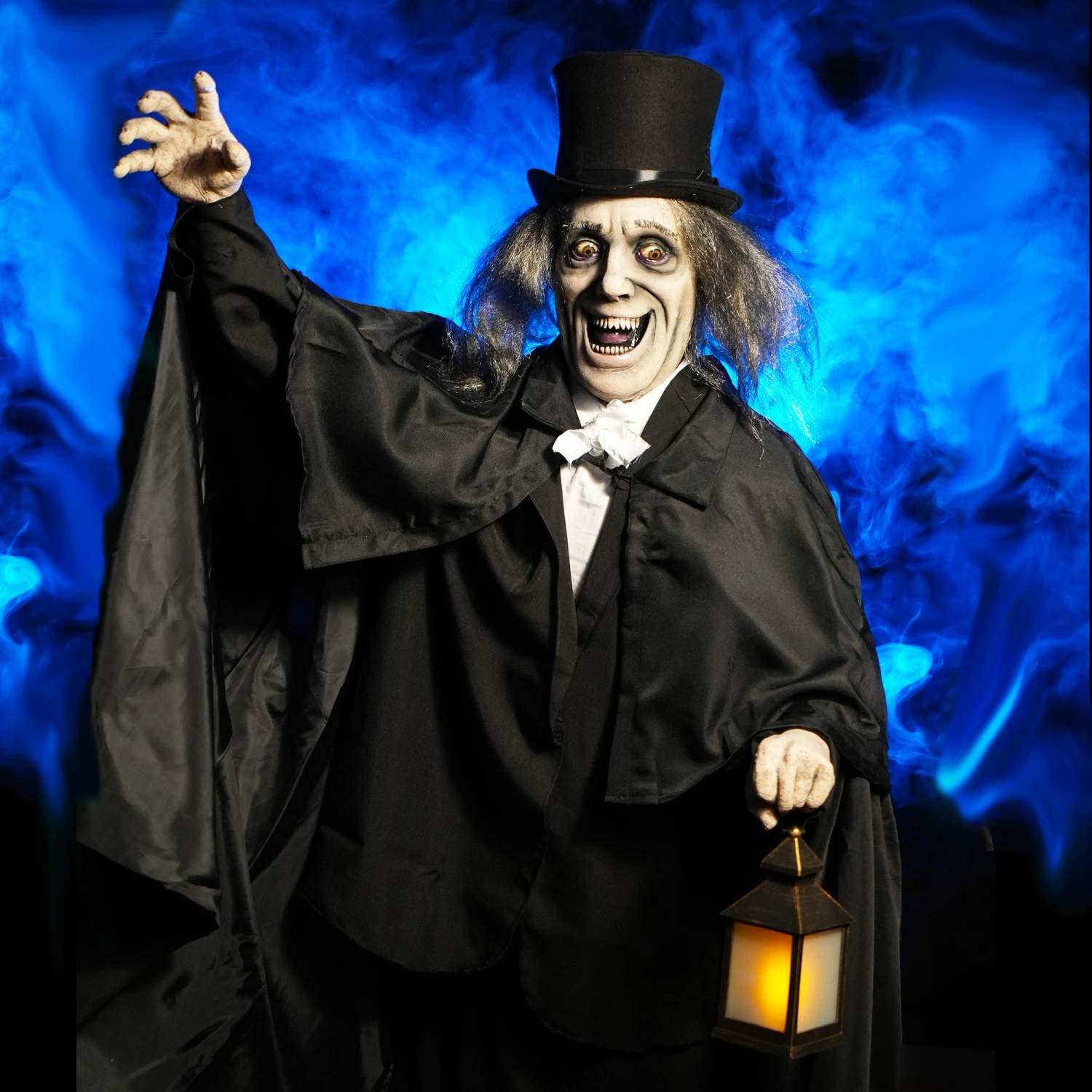 Are you a fan of classic horror movies? We have the Halloween prop for you! After Midnight is a professional quality, life-size, standing Halloween prop inspired by the classic silent horror film, London After Midnight, starring Lon Chaney. Standing over 6 feet tall, this prop is made of high-quality latex and is foam filled with an armature inside. It comes with a metal stand so that it can be displayed standing. It includes a battery-powered LED lantern for added effect. The details we have included with this prop are amazing! Sculpted by Jordu Schell this is a prop you can decorate and display with pride in your home, yard, haunt or retail space.