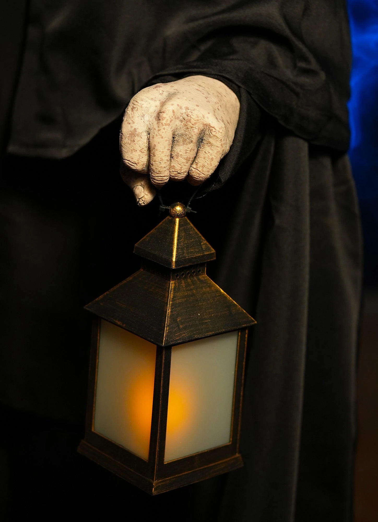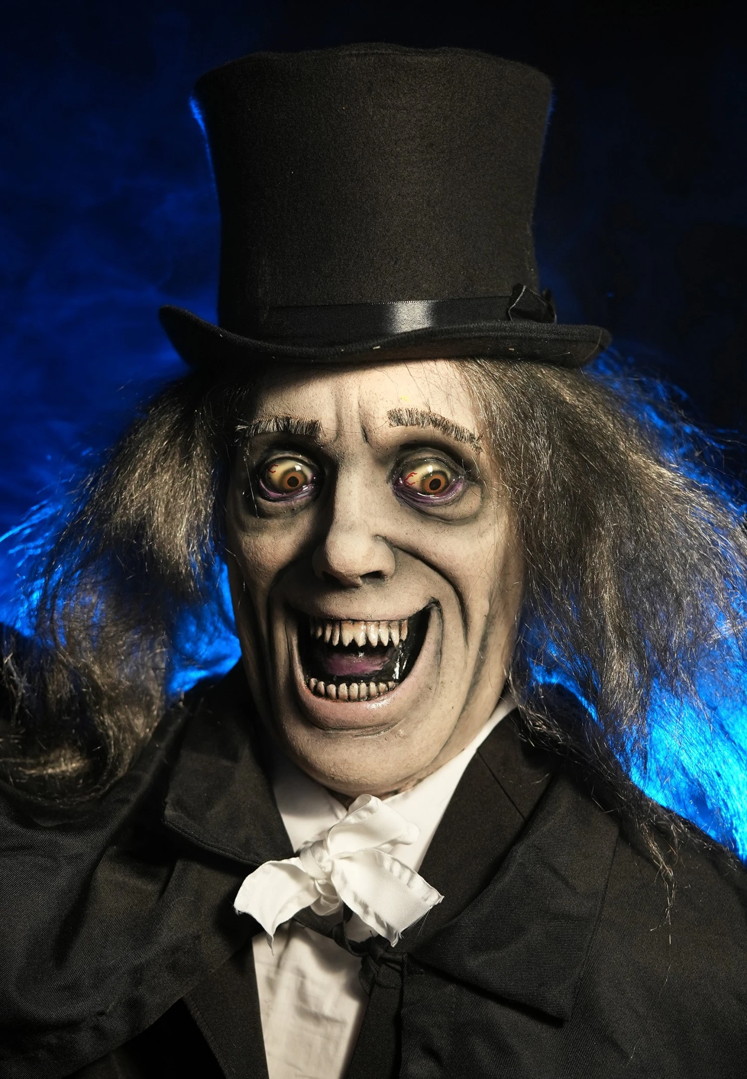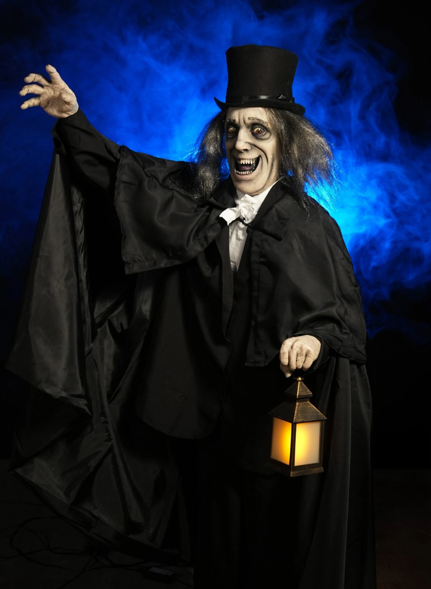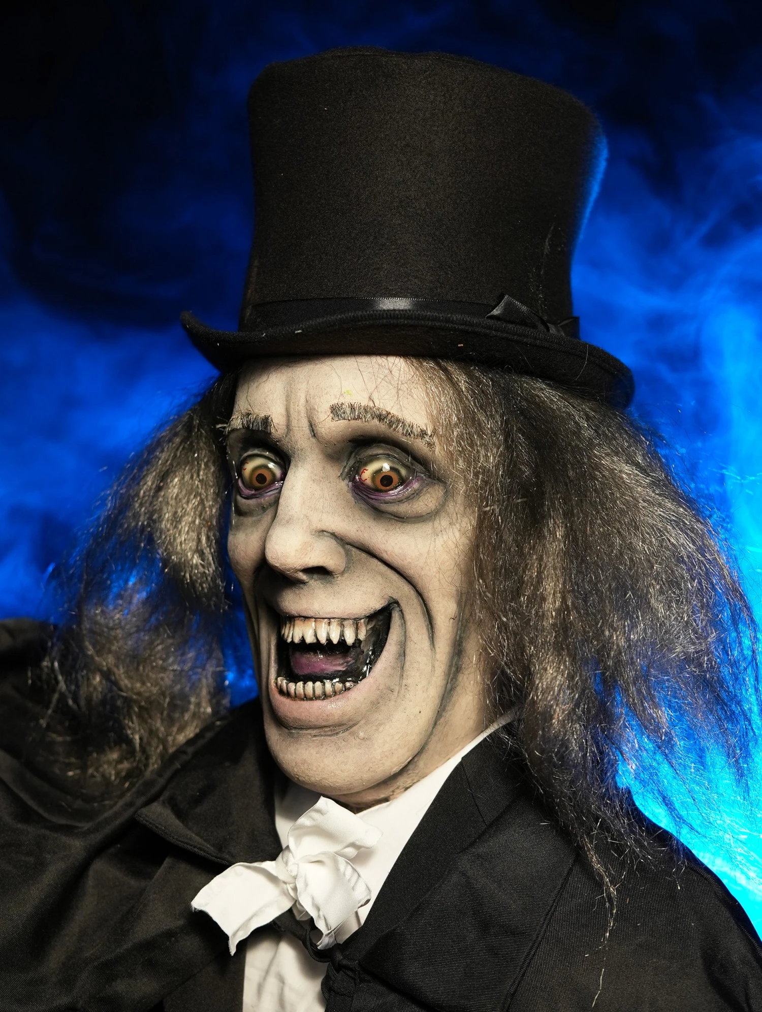 Are you a fan of classic horror movies? We have the Halloween prop for you! After Midnight is a professional quality, life-size, standing Halloween prop inspired by the classic silent horror film, London After Midnight, starring Lon Chaney. Standing over 6 feet tall, this prop is made of high-quality latex and is foam filled with an armature inside. It comes with a metal stand so that it can be displayed standing. It includes a battery-powered LED lantern for added effect. The details we have included with this prop are amazing! Sculpted by Jordu Schell this is a prop you can decorate and display with pride in your home, yard, haunt or retail space.