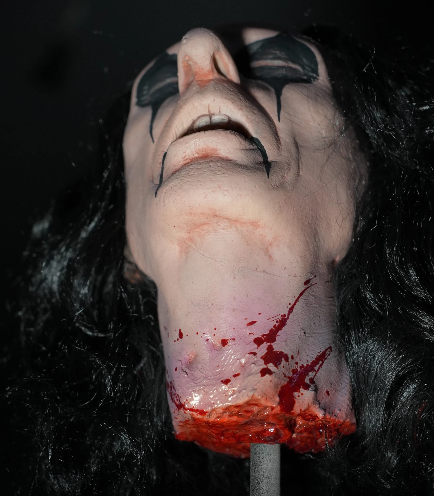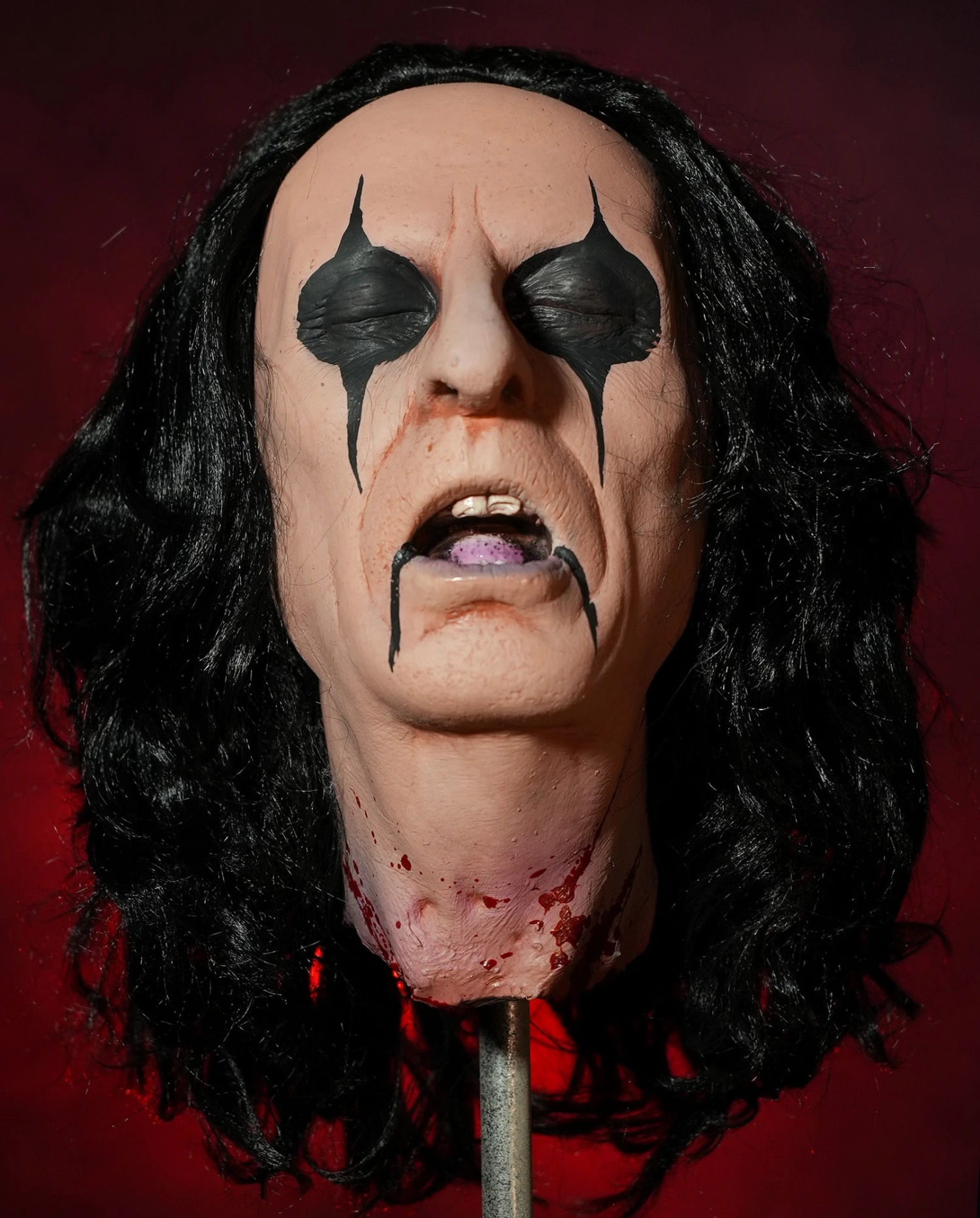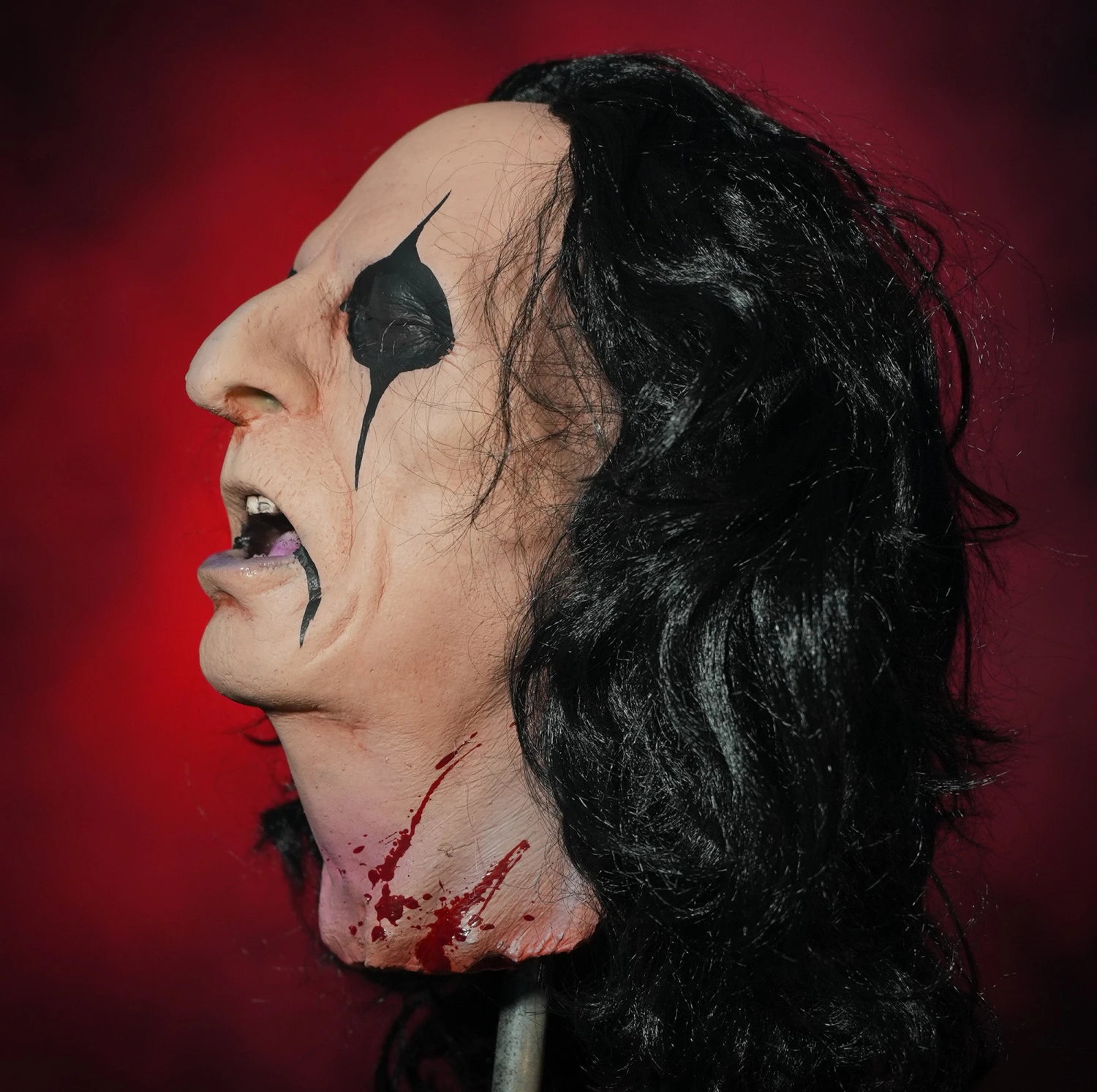 ALICE COOPER GUILLOTINE HEAD! This officially licensed Alice Cooper Head Prop is out of the same mold as the Guillotine Head used on stage. Collectors and Alice Cooper fans need this amazing piece! This severed head prop is expertly crafted and hand painted at Distortions Unlimited in the USA. Made of latex and foam filled.Â