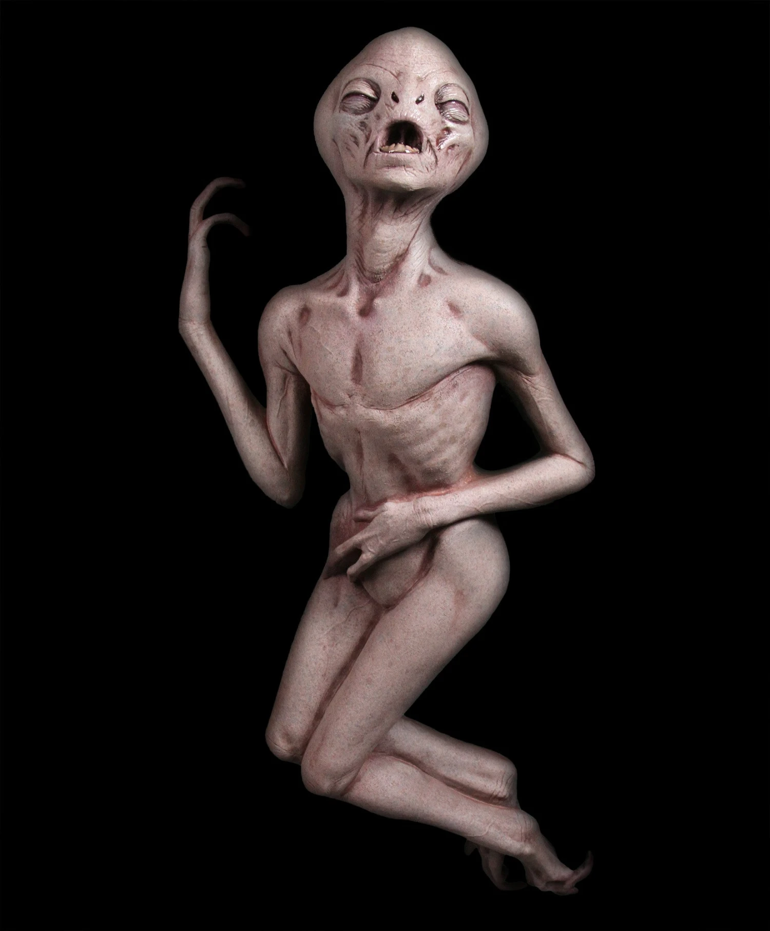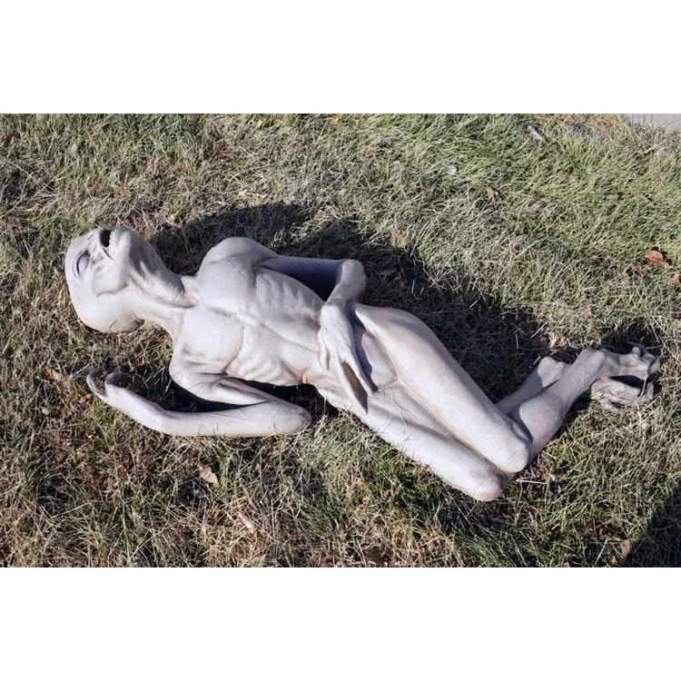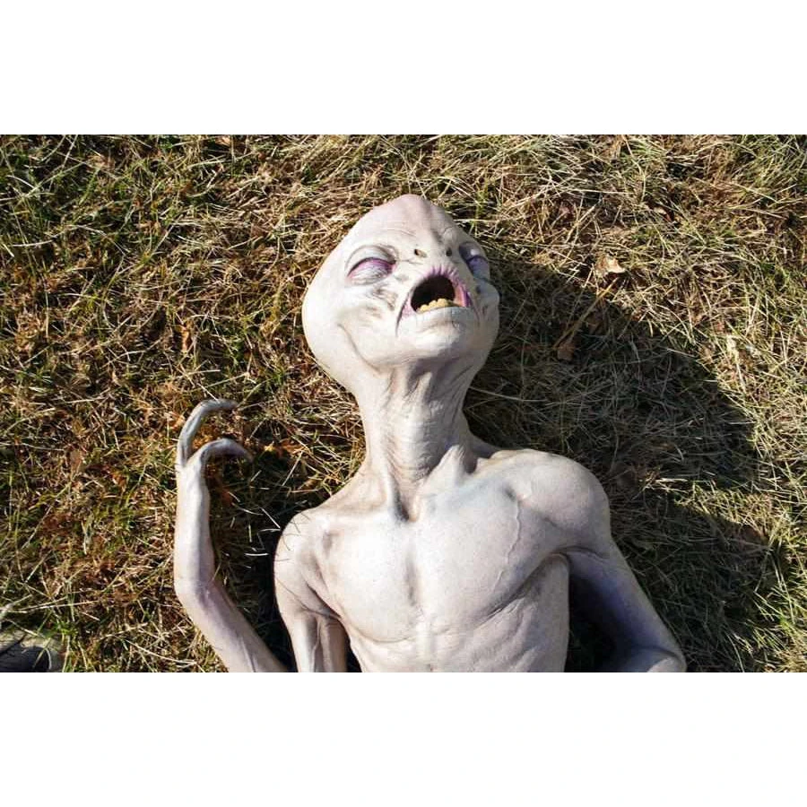 Our Alien Death prop depicts a dead or dying alien and is perfect to create a creepy UFO crash site scene. This expertly sculpted alien prop is made of latex and foam filled, and hand painted at Distortions Unlimited in the USA. This prop is flat-backed. Distortions props our made to last!