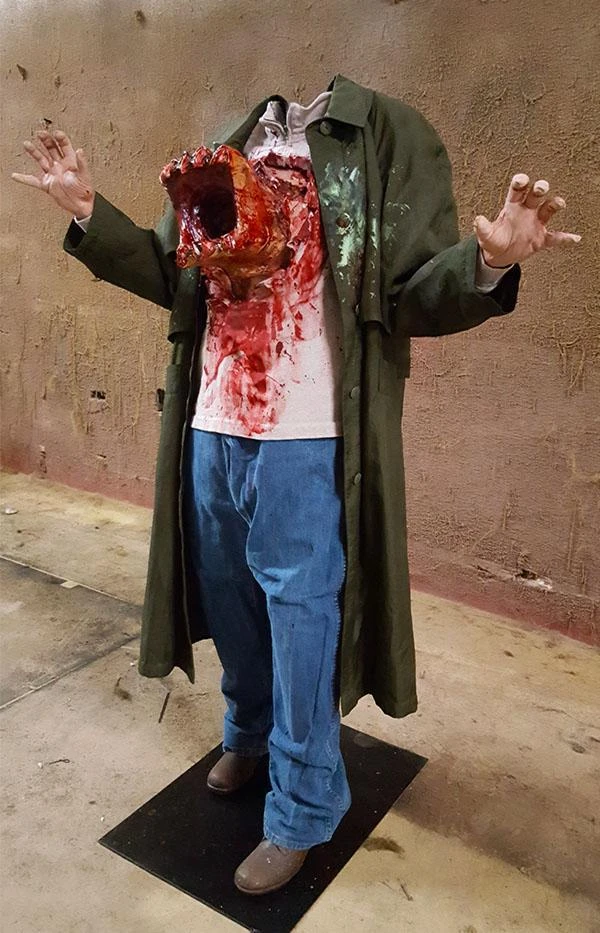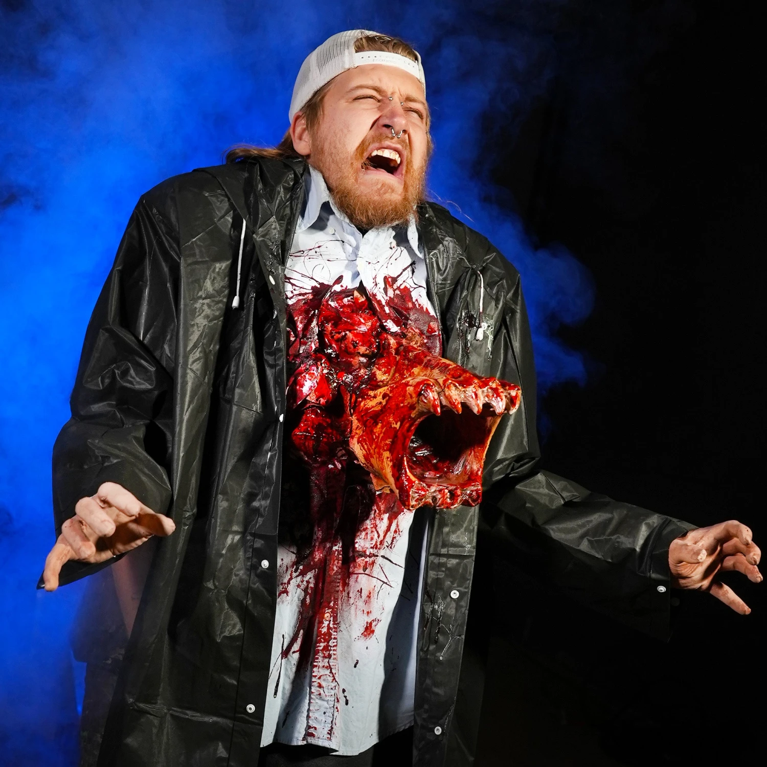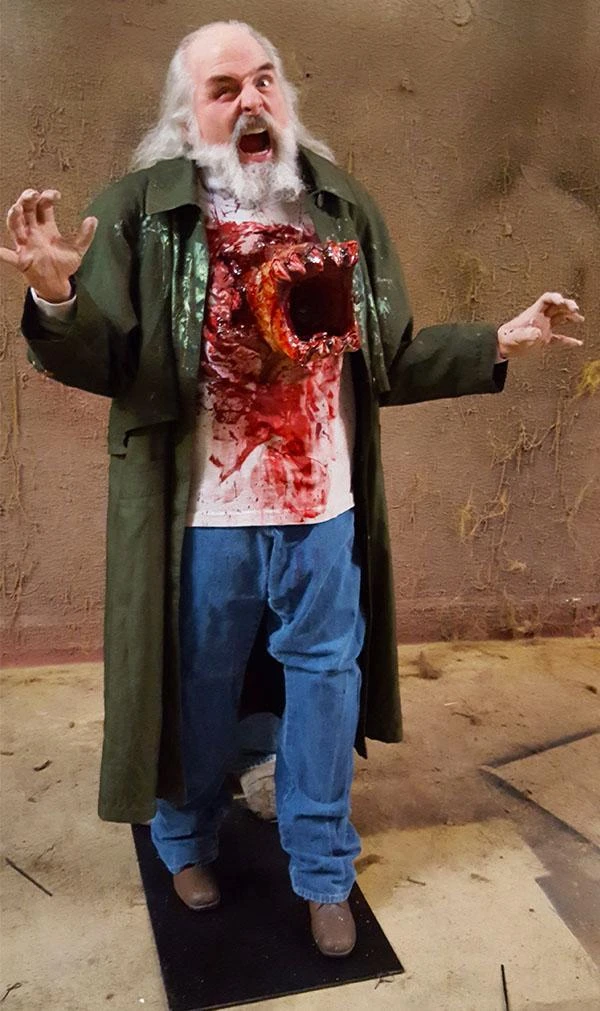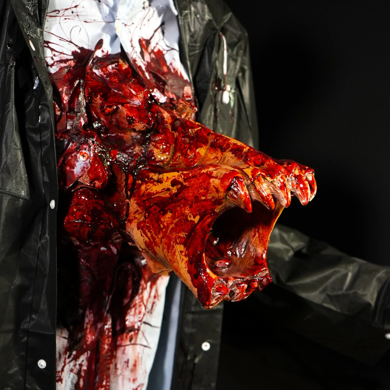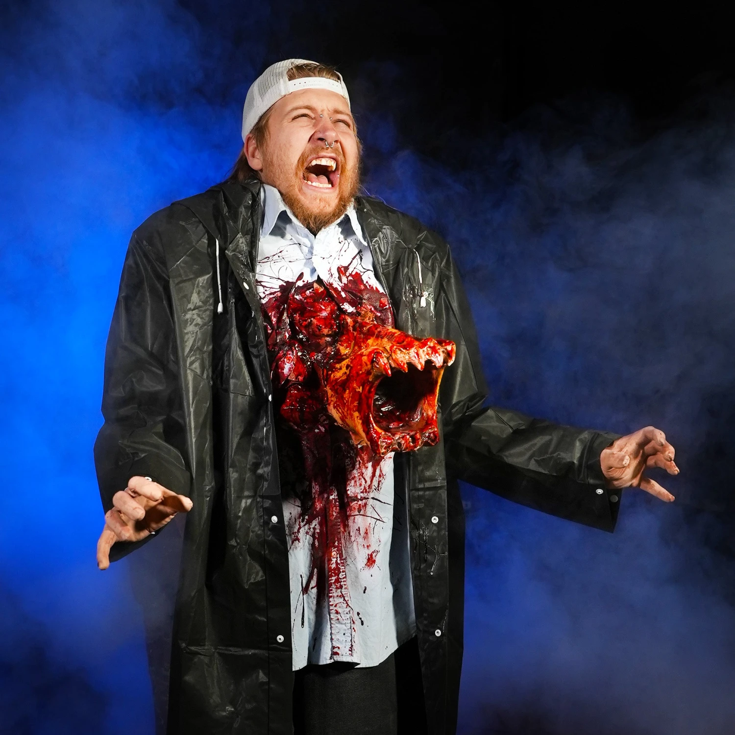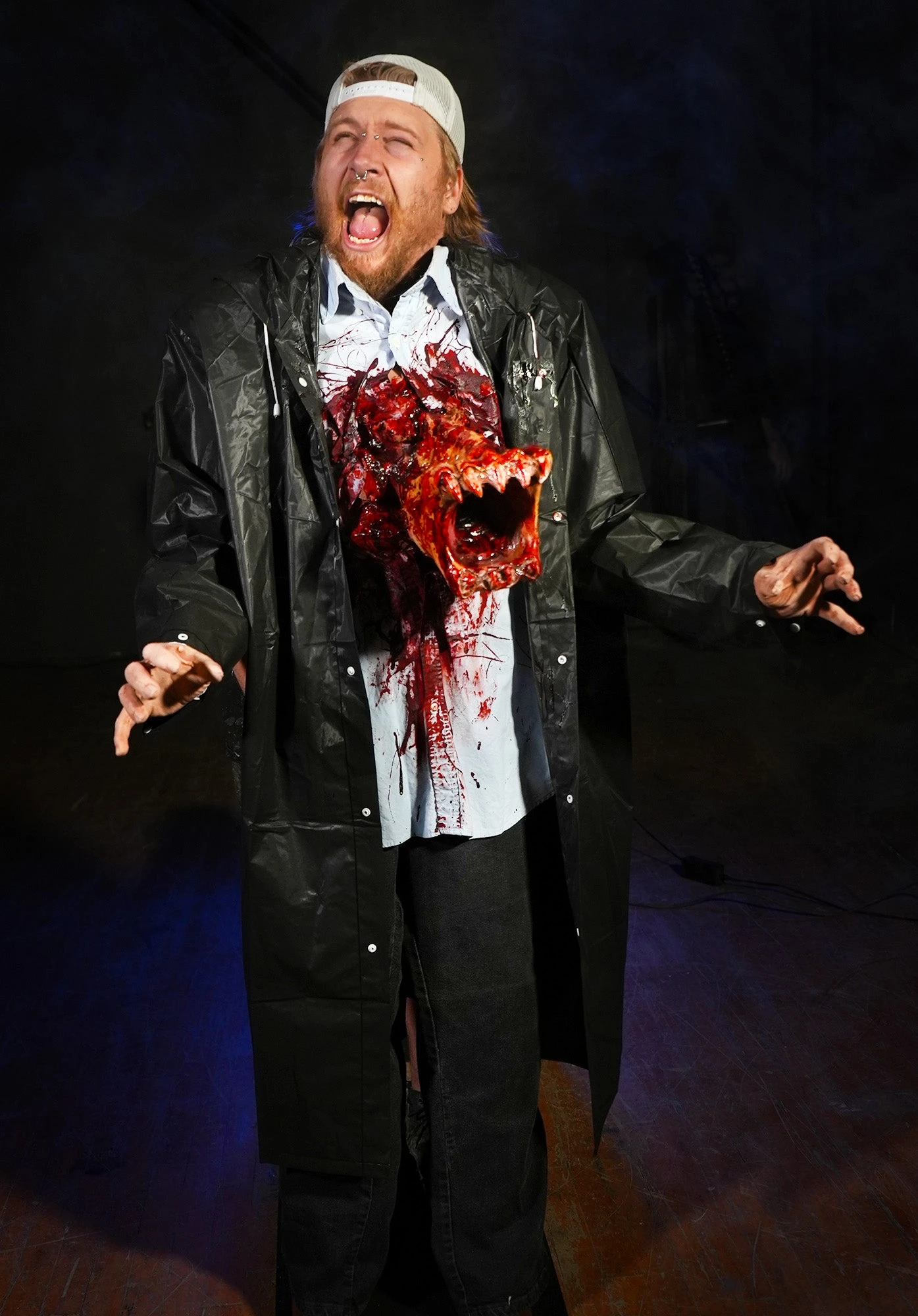 3D Chestburster Photo Op made of latex and foam with armature and hand painting. This gory chestbursting alien photo op is tons of fun for your guests and works great at theme parks, haunted houses, Halloween parties, home haunts and more. Just set your head on the cut out neck space and give scream or smile to make this high impact photo op come to life. Comes with metal stand, bendable armature in arms. Clothing may vary.