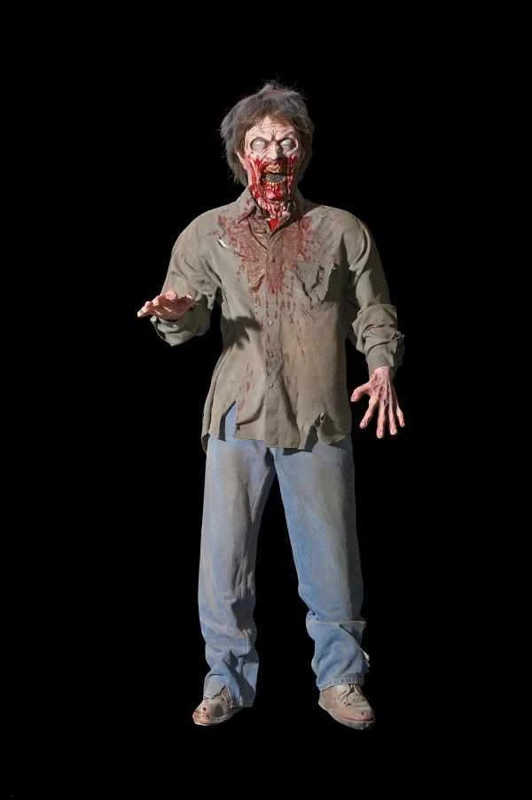 Cody is a static latex and foam zombie prop! Great for Halloween and Haunts! This life size, standing Halloween prop is made at Distortions Unlimited in the USA.