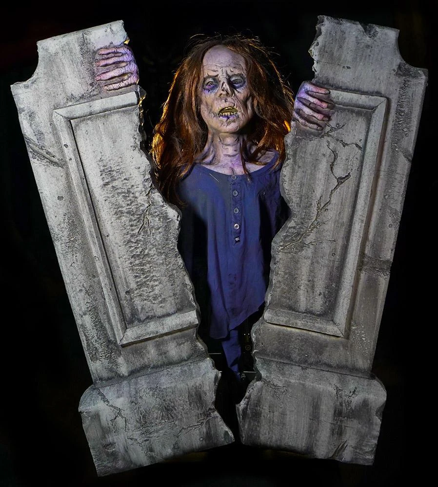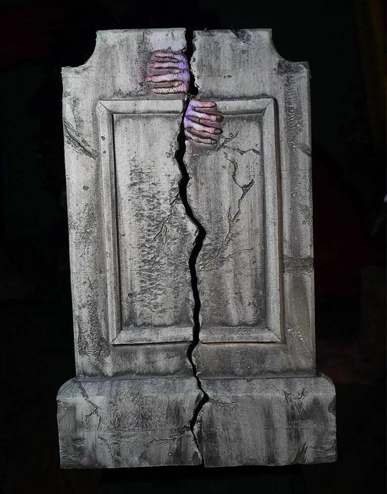 Cracking Crypt is a Distortions Unlimited Frightronic zombie tombstone prop. Amazing! This gravebuster tombstone opens and closes as the zombie rises and falls. This zombie animatronic is all electric, just plug it in an it moves. Imagine our Cracking Crypt in a cemetery, graveyard, or zombie scene. Made of latex and foam with metal armature. Aprox. 36 x 24 x 12 in. Our Distortions Halloween props are high quality and durable. We have a huge selection of zombie animatronics for sale to help you create your own scary Halloween cemetery scene. *Clothing may vary. Comes with an audio download link. Does not include audio player.