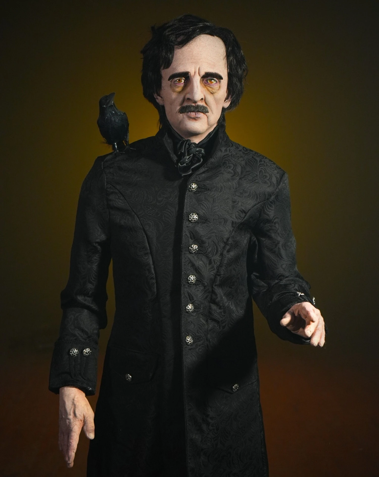 This quality Edgar Allan Poe standing prop display is new for Distortions Unlimited in 2021. Standing over 6 ft. tall this realistic sculpt is by Jordu Schell, and is hand crafted and painted at Distortions. Includes the bird on his shoulder! Perfect for fans, collectors, and museums.