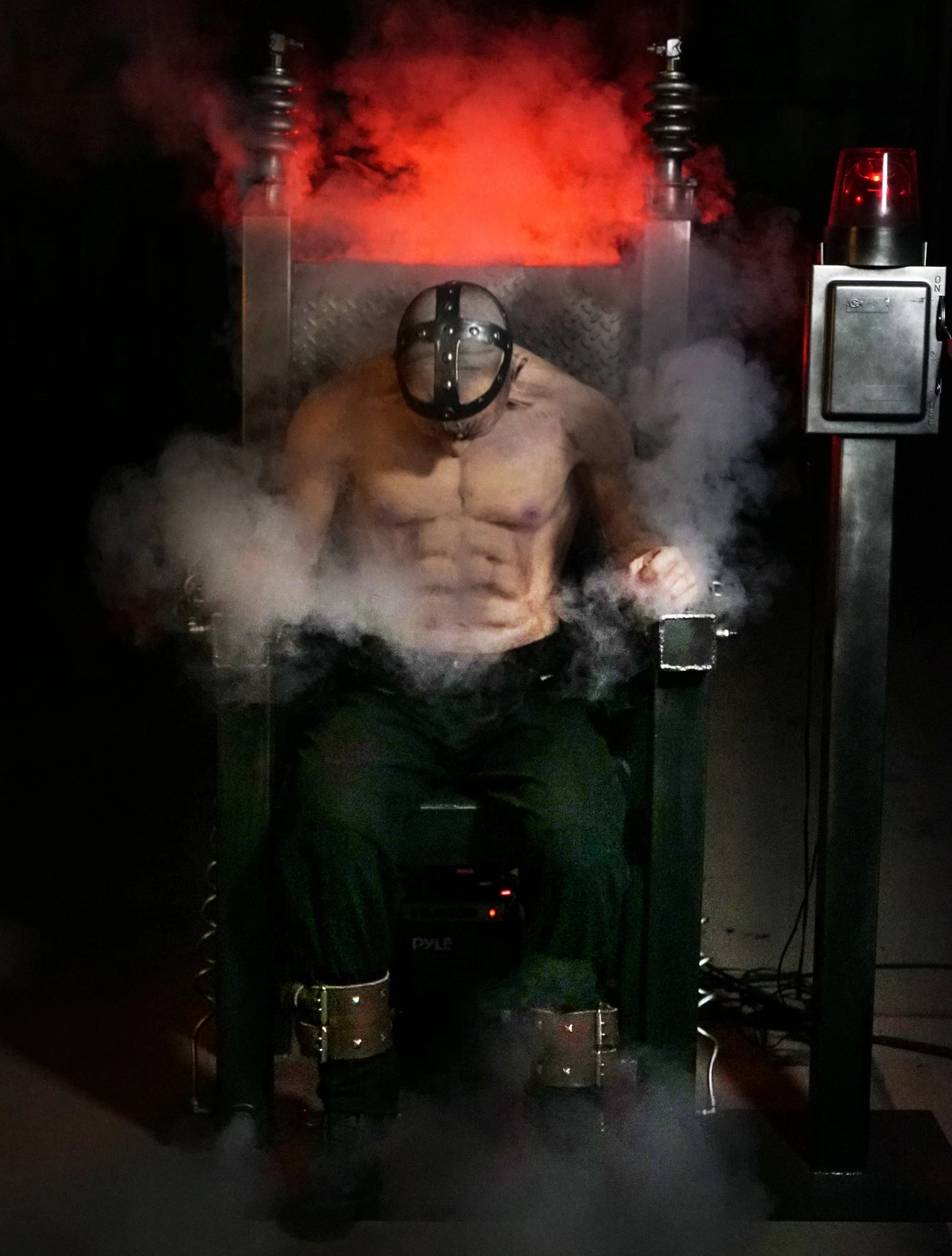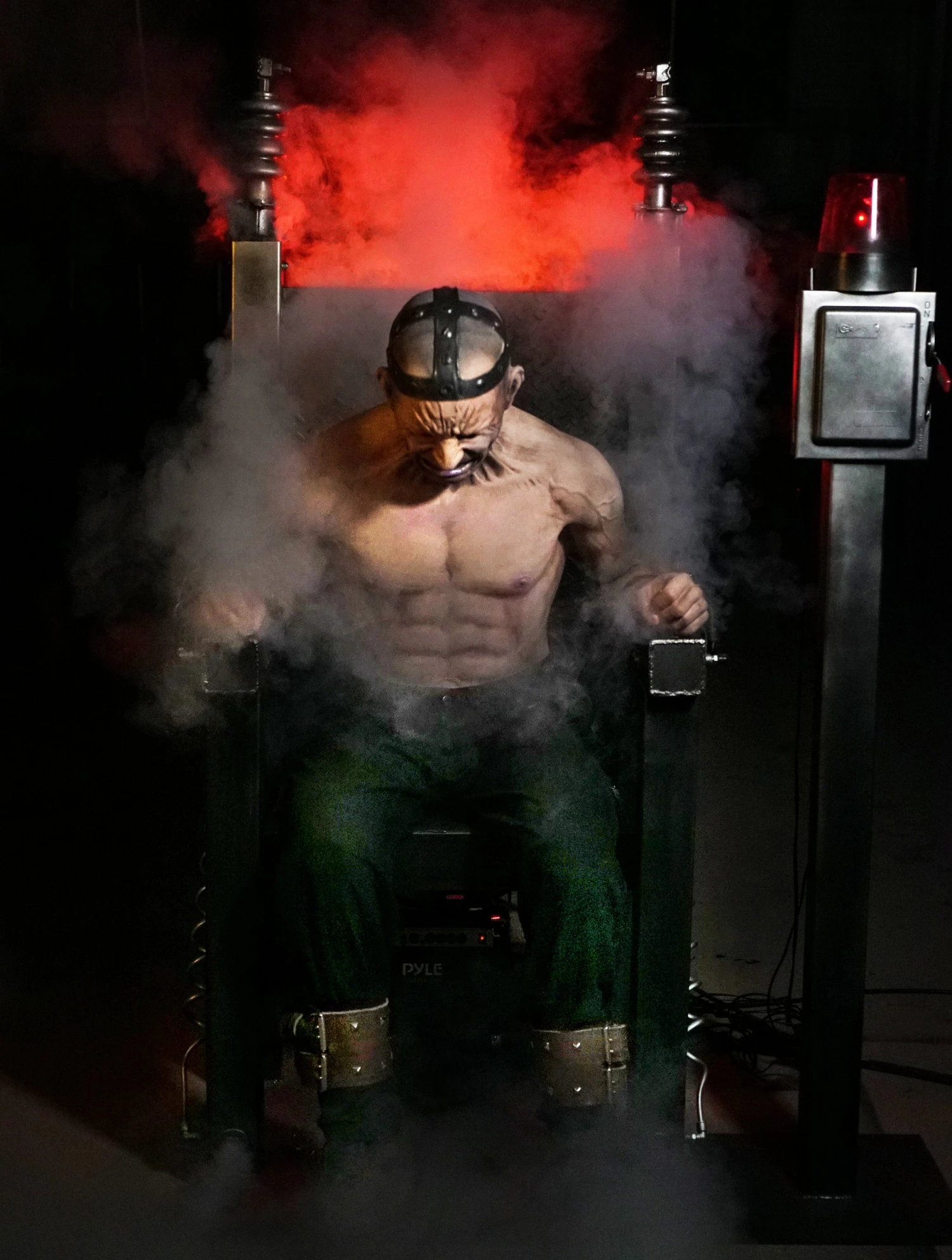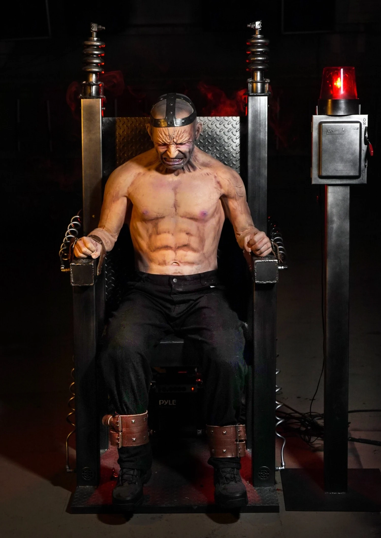 Electric Chair Revenge Animatronic Prop is a violent and startling electric chair haunt prop. This 2019 Halloween animatronic is an exciting tribute to our original Electric Chair that changed the haunt industry. If you are a fan of our classic Distortions Electric Chair prop you will love this one as well. This dynamic piece uses a technology developed by Distortions to create fast and organic movement in two phases: insane thrashing and high speed vibrating. Due to the violent movement, the chair is constructed of entirely welded metal. Smoke is channeled though the metal coming out of the hands and feet. The switch is thrown and screaming, thrashing, smoke and sound of electricity assaults the senses. The unit has a switch or can be operated by optional timer, motion sensor, pressure pad or actor. Requires AC power, and 125 psi air compressor. Approx 6′ tall, 3′ wide and 4’6″ deep. Includes fog machine, Electric switch box on metal stand, red LED light, Becon light, controls and sound.