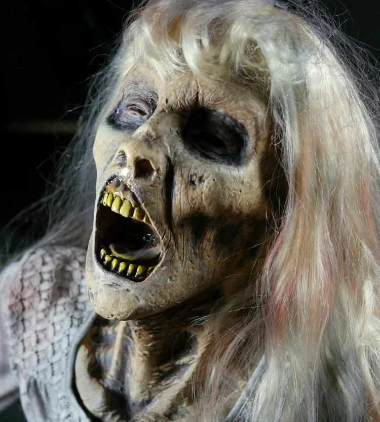 Grave Buster Barb is a zombie animatronic perfect for Halloween and haunts. She rocks back and forth and appears to be climbing from her grave. Wonderful for your cemetery, graveyard, or zombie scene. Latex and foam with armature. Hand painted at Distortions. All electric prop.
