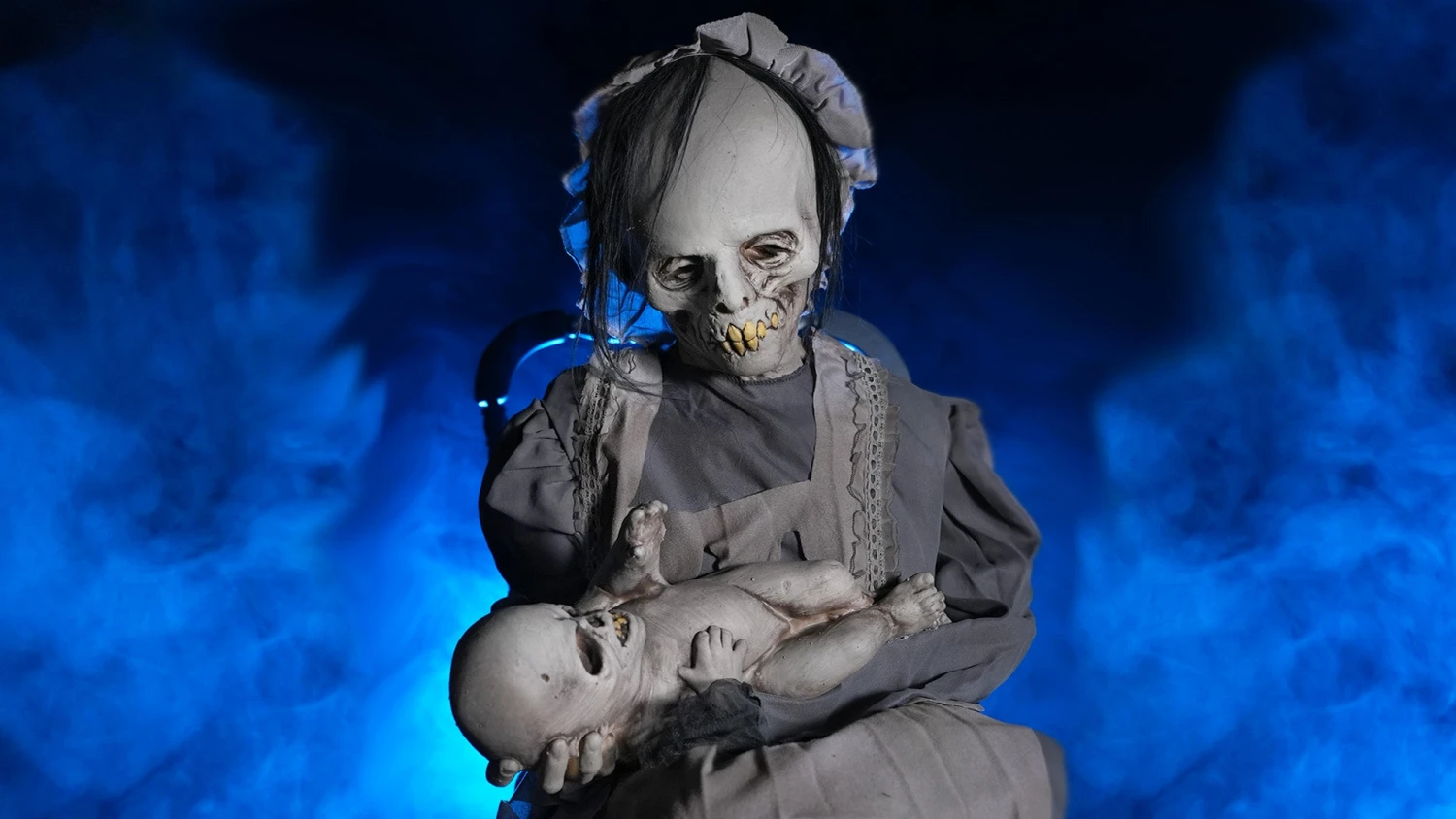 Our Lullaby static Halloween prop is an incredibly creepy addition to your spooky scene. This ghostly skeleton nanny, holding a baby is perfect for haunted house scenes, home haunts, Halloween events and professional dark attractions. Expertly crafted at Distortions Unlimited.