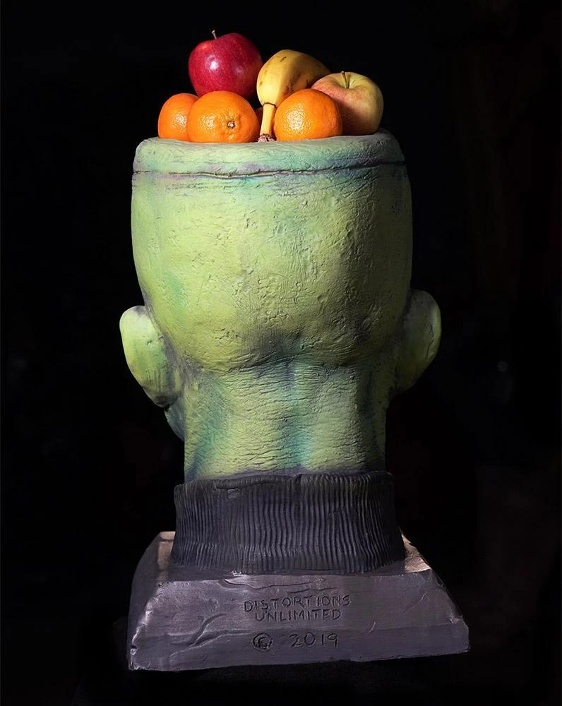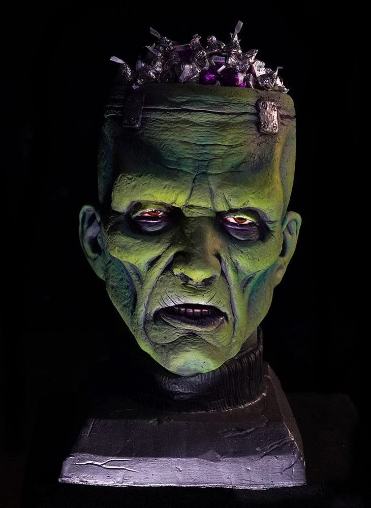 Monster Bowl Halloween prop, latex and foam candy dish! Fill this work of monster art with fruit, candy, or other dry items. Perfect for classic monster lovers. Sculpted and painted at Distortions Unlimited. Get into the Halloween spirit with our Monster bowl. Made of latex and foam. 18.5x12x12 inches