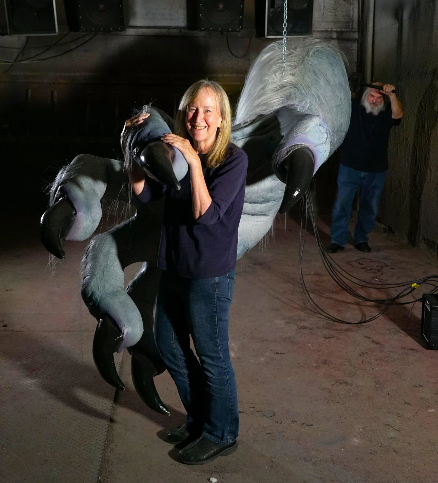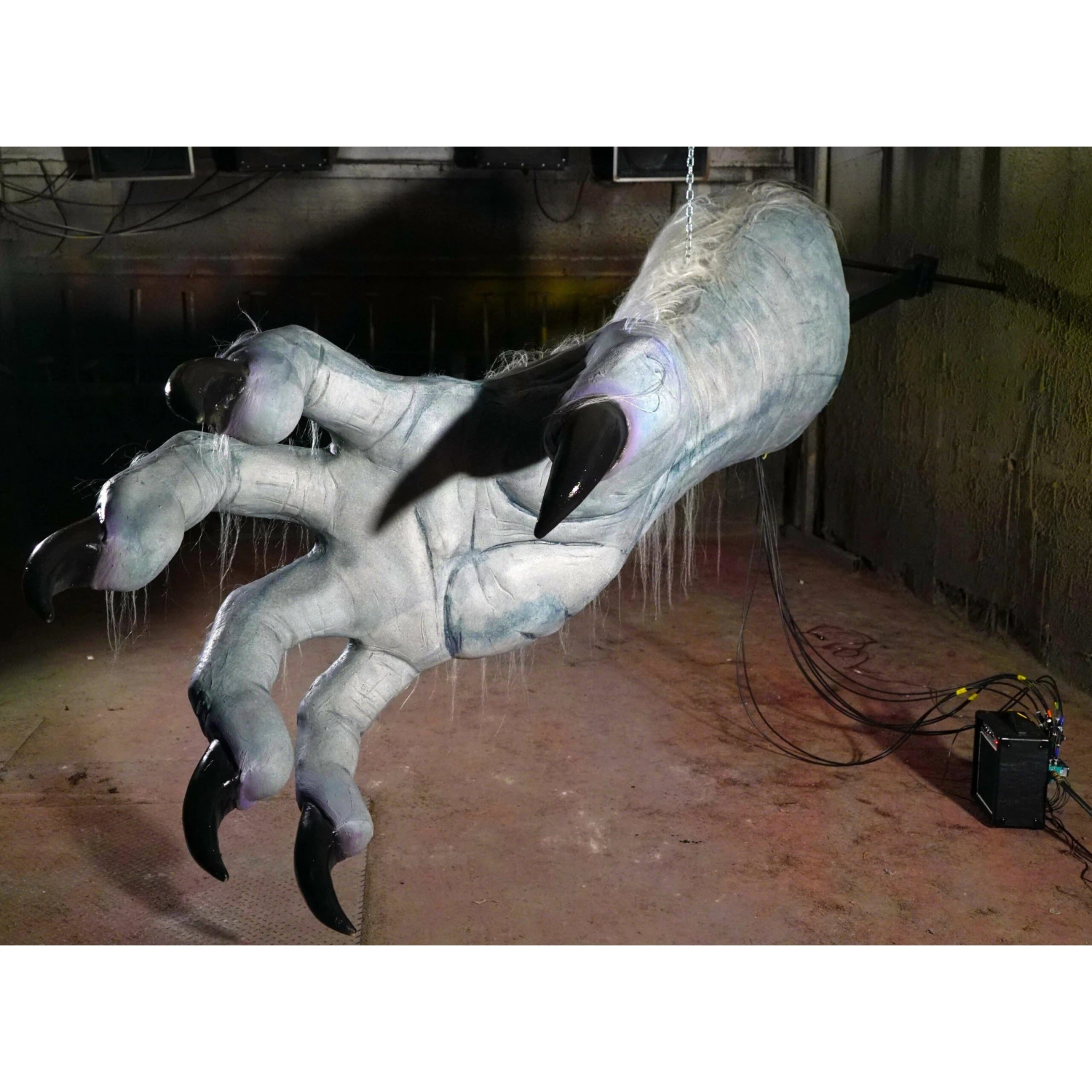 Giant Animatronic “Yeti” Monster Hand! Each finger moves and grabs! Includes controls, program, sound, and speaker. This hand hangs on a chain and must be secured to a solid beam from above as the hand ways approx. 300 lbs. An operator activates the program, which controls the finger movements, and then manually pushes and moves the hand back and forth. This is a great animatronic prop for theme parks, haunted houses, dark attractions, events and more.