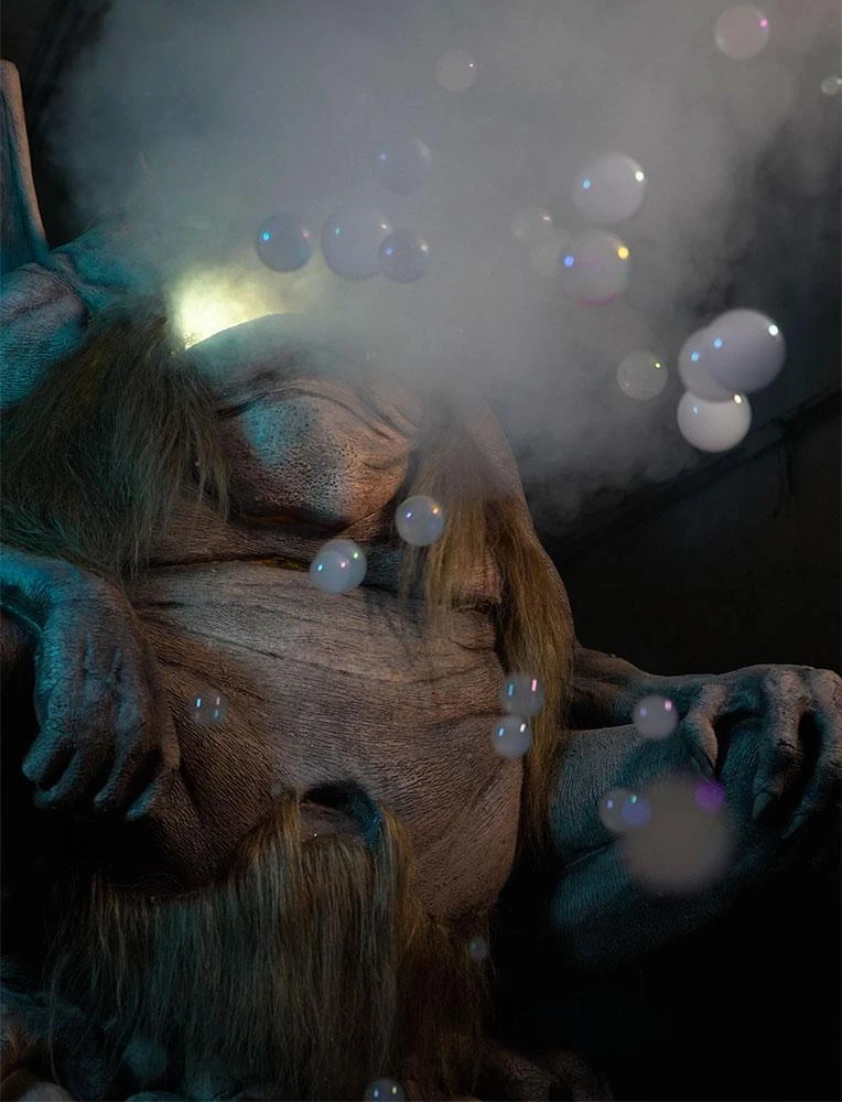Mr. Bubblebarf is a funny Halloween and theme park animatronic gargoyle that belches bubbles and fog. He talks, moves his eyes, and blows bubbles with fog. An impressive animatronic for your event that will have your guests entertained and laughing. Kids love to run around and try to pop the bubbles! He can fit in a variety of scenes including haunted attractions, fantasy themed events, parties, theme parks, mini golf courses and many more. Made by Distortions Unlimited. 72inX50inx89in