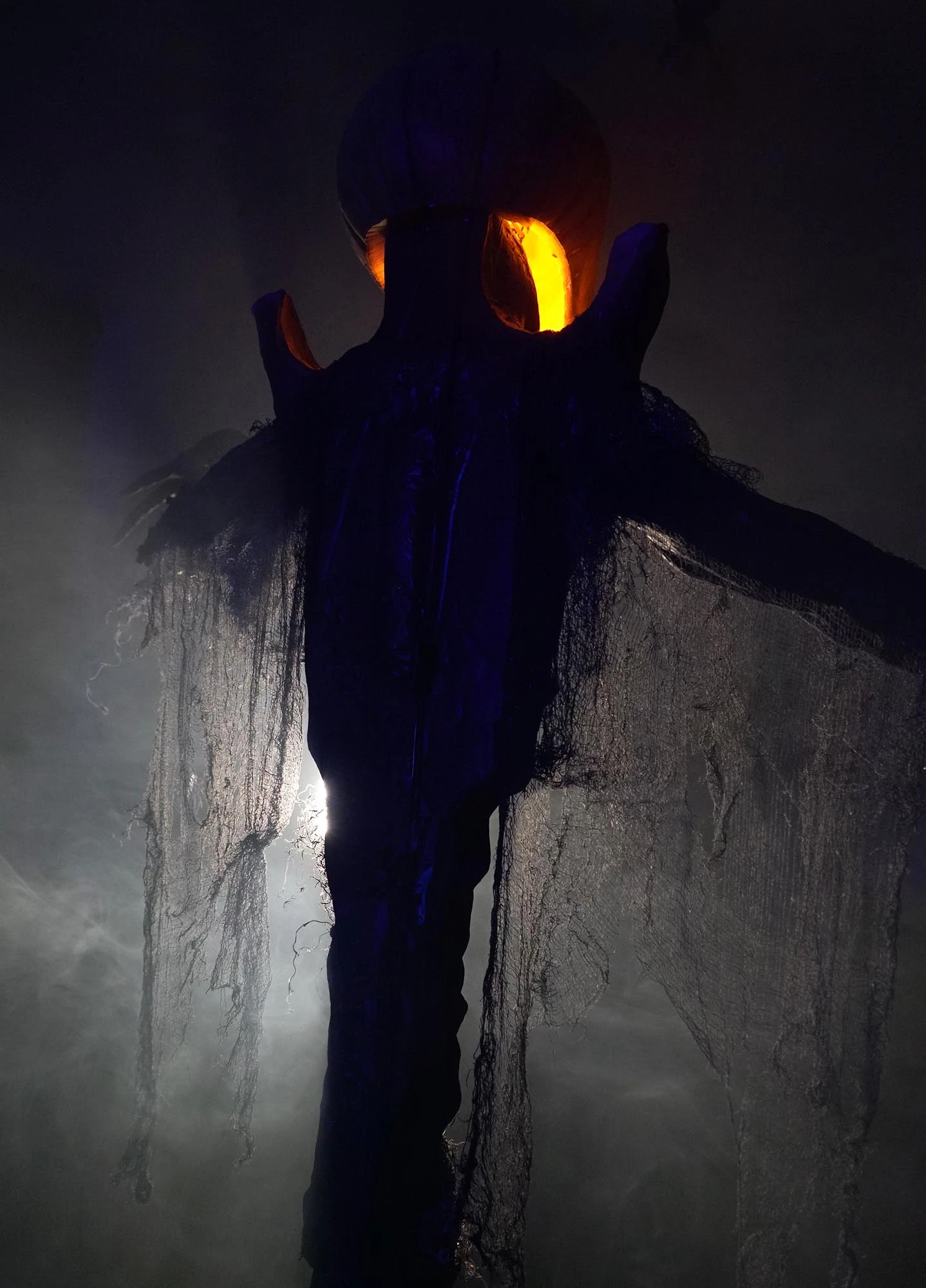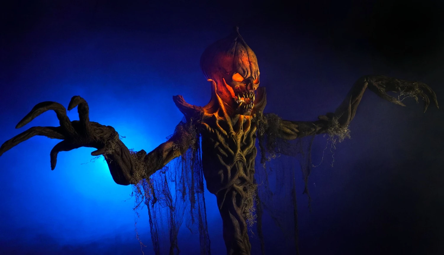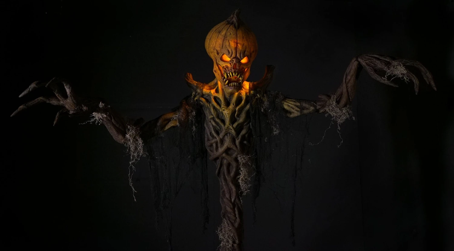 Towering over 8 Ft tall, Pumpkin Stalker rules over its creepy pumpkin patch. This terrifying vision prowls through your field of nightmares…or perhaps your yard or home haunt! A perfect giant Halloween prop decoration for Halloween events, dark attractions, haunted corn mazes, creepy pumpkin patches and home decorating.