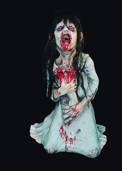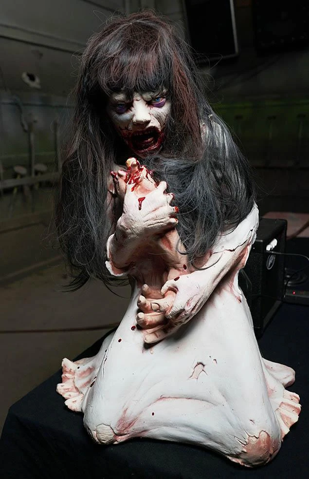 Spitting Debby is a zombie girl animatronic. The professional animated zombie prop moves her head and chomps on the leg she is holding, and then turns her head upward to spray blood (water) at those that look on in disgust. This is a high impact, creepy Halloween and haunt prop built to last of quality material at Distortions Unlimited.