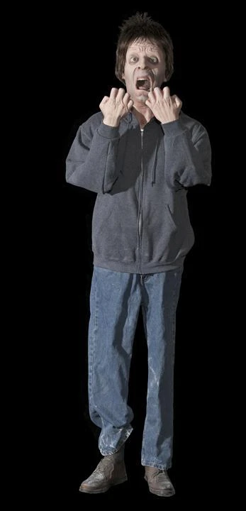 Spooked is an all electric Frightronic prop. This scared shaking man is quivering in fear at the sight of something spooky! This full size standing animatronic is perfect for a variety of decorating needs including Halloween, haunts, and themed attractions. Includes link to download Frightronic audio track. * Clothing may vary.