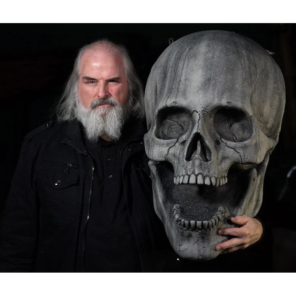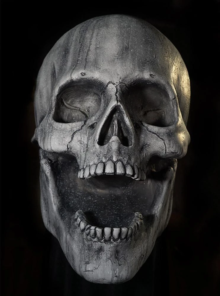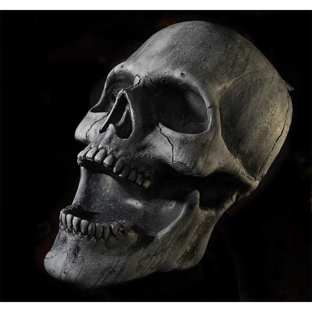 The Stone Skull is an impressive giant skull decoration, painted to look like stone, by Distortions Unlimited. 30x18x13 inch, flat backed skull, made of latex and foam, hand painted, with two rings for hanging. Amazing giant skull prop decoration.