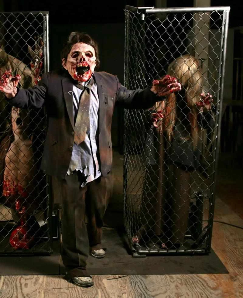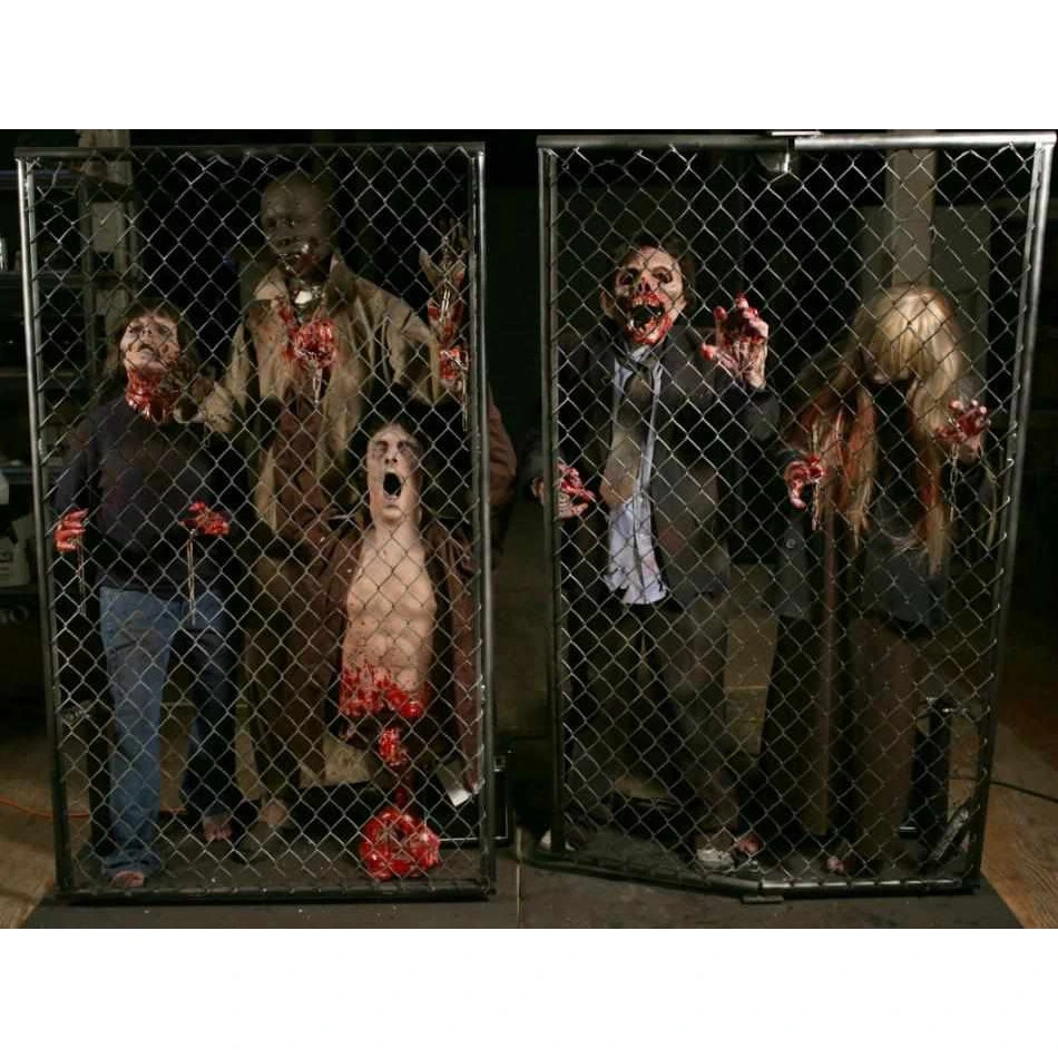 This Zombie shock includes both the Zombie Outbreak and Zombie Breakout. Just when you think the zombies are safe behind the fence one breaks out for an unforgettable scare! Includes 3 animated zombies, one static zombie, 2 animated moving fences, a zombie costume, plus sound and lights. The costumed zombie is the one that breaks out! AC power and air compressor are needed. Use this zombie scare as part of your haunted house or Halloween attraction and have fun watching you guests scream and laugh as the zombies scare them! Distortions Unlimited has been creating ground breaking monsters in the Halloween industry for over 40 years.
